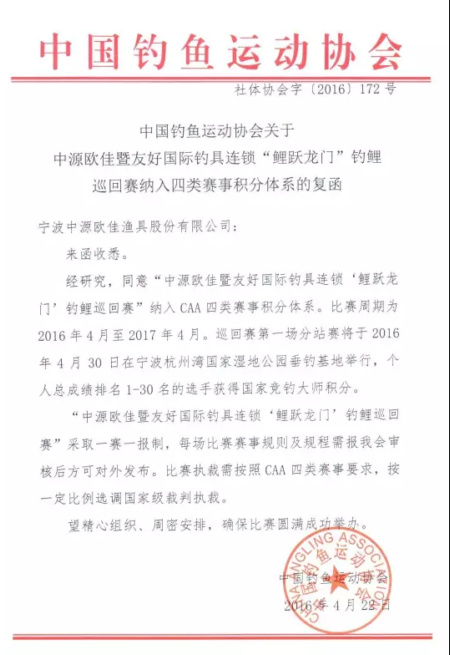 經(jīng)研究,同意“中源歐佳暨友好國(guó)際釣具連鎖‘鯉躍龍門(mén)’釣鯉巡回賽”納入CAA四類(lèi)賽事積分體系。比賽周期為2016年4月至2017年4月。巡回賽第一場(chǎng)分站賽將于2016年4月30日在寧波杭州灣國(guó)家濕地公園垂釣基地舉行,個(gè)人總成績(jī)排名1-30名的選手獲得國(guó)家競(jìng)釣大師積分。